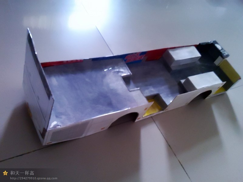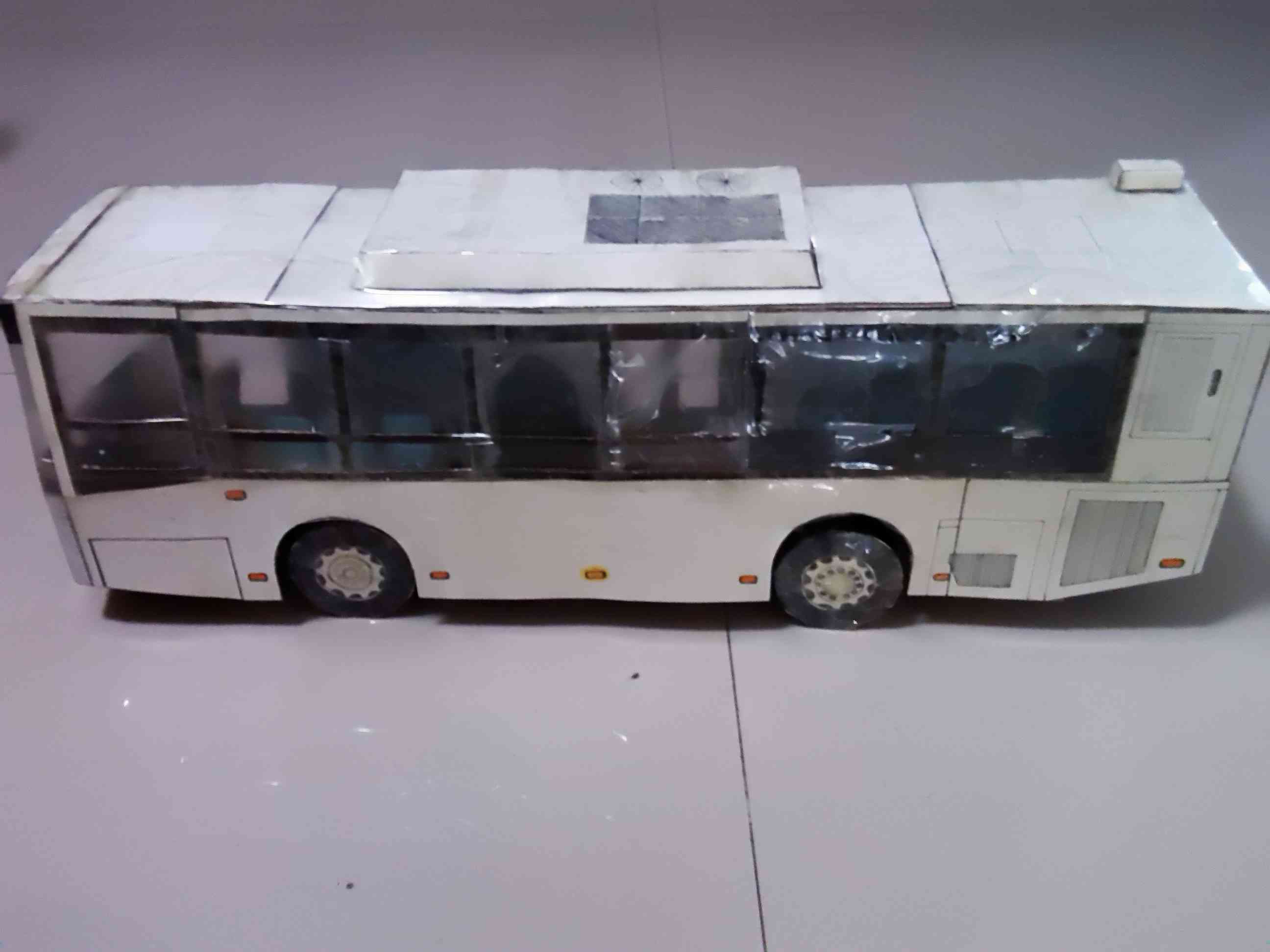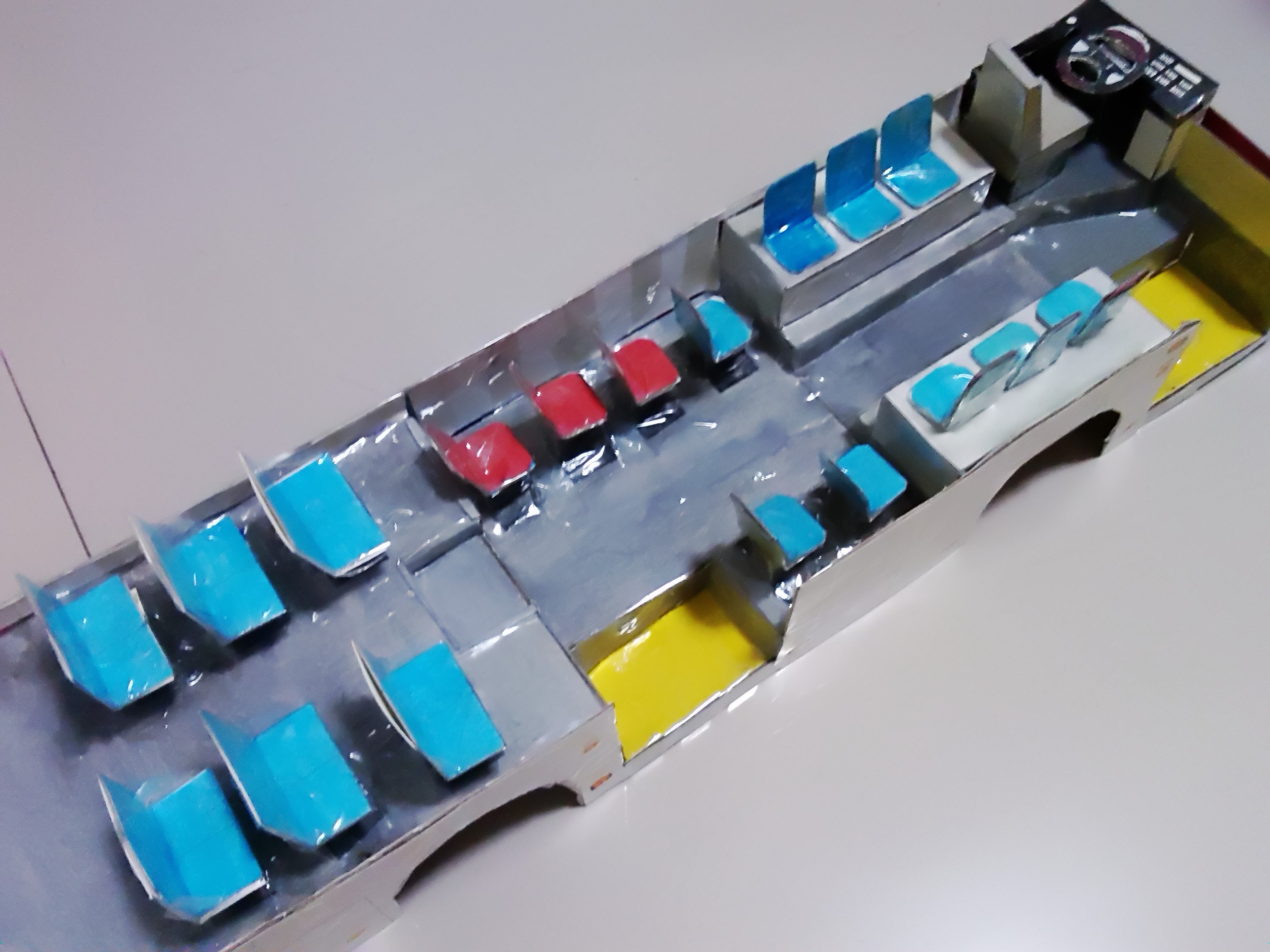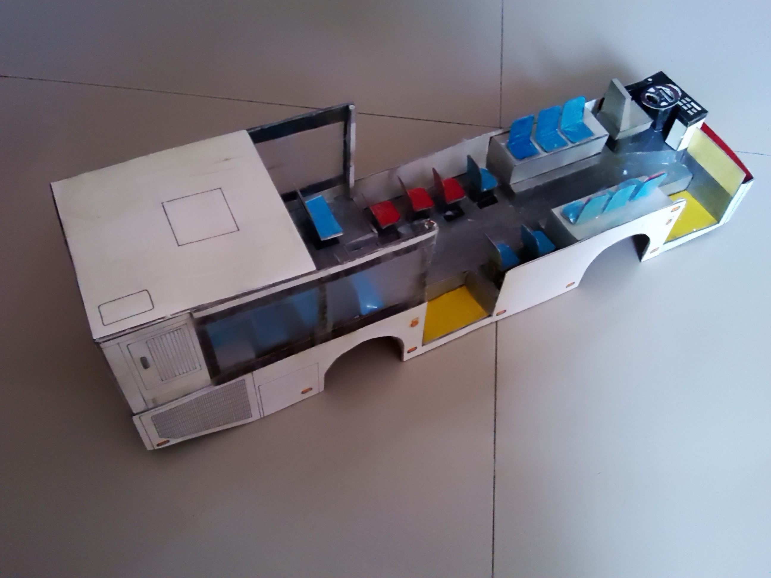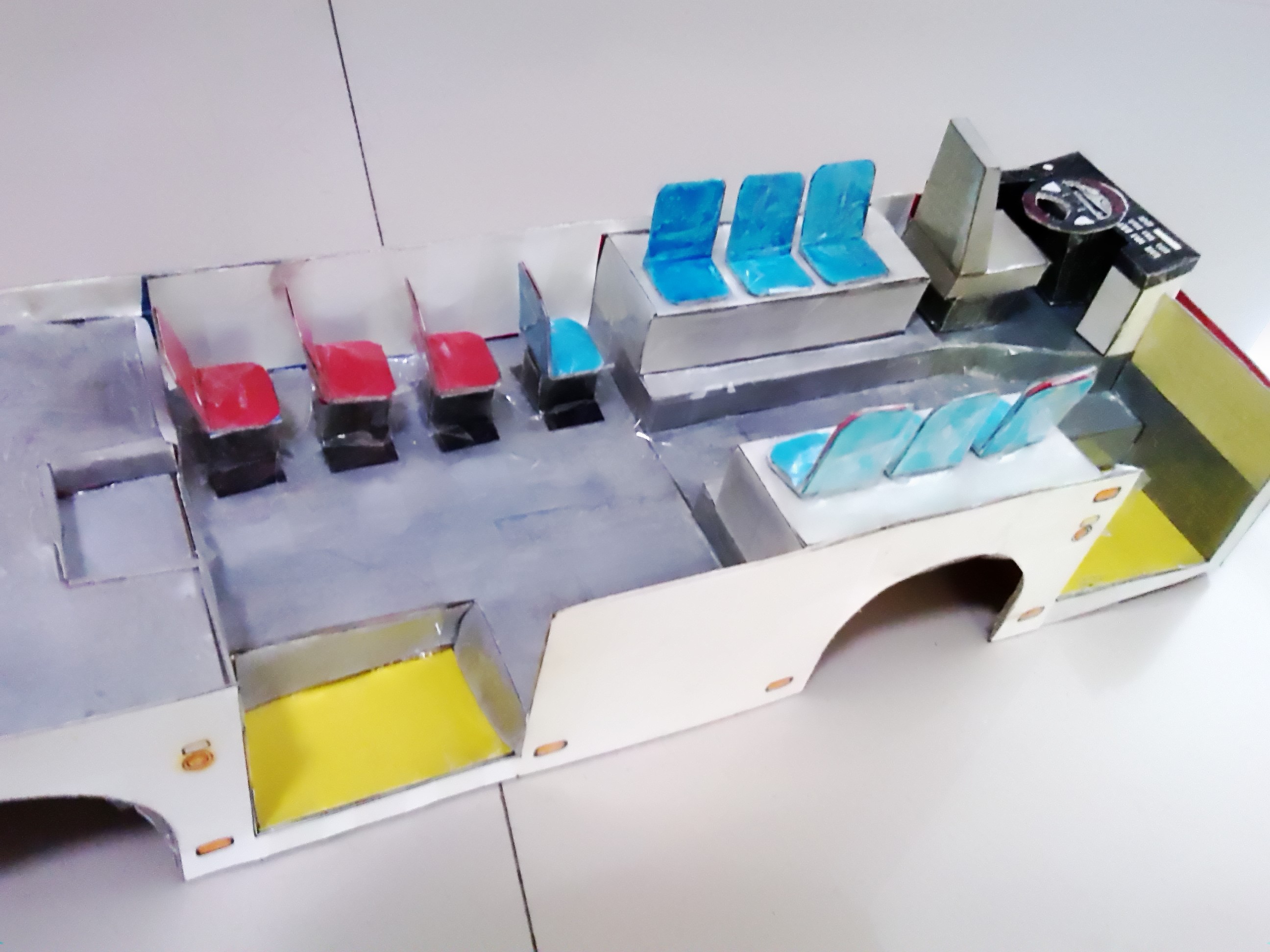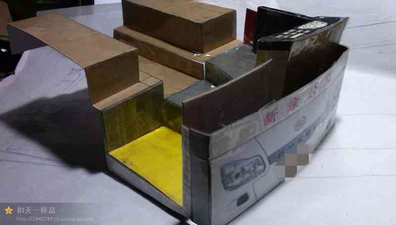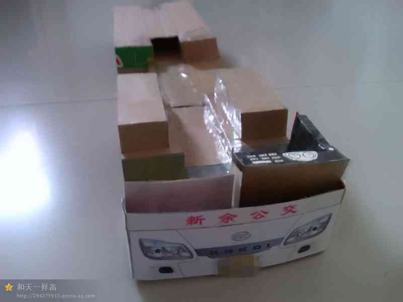 车身外表完善 开始内饰制作,驾驶区 驾驶区的细节是费了一点心思的 乘客座椅,有点简陋~ 做好后一个一个粘上 还有爱心座椅 总算粘贴完了 就差侧窗、封顶和前挡了 封装完成,对了,还忘了轮胎 前脸效果 置顶空调