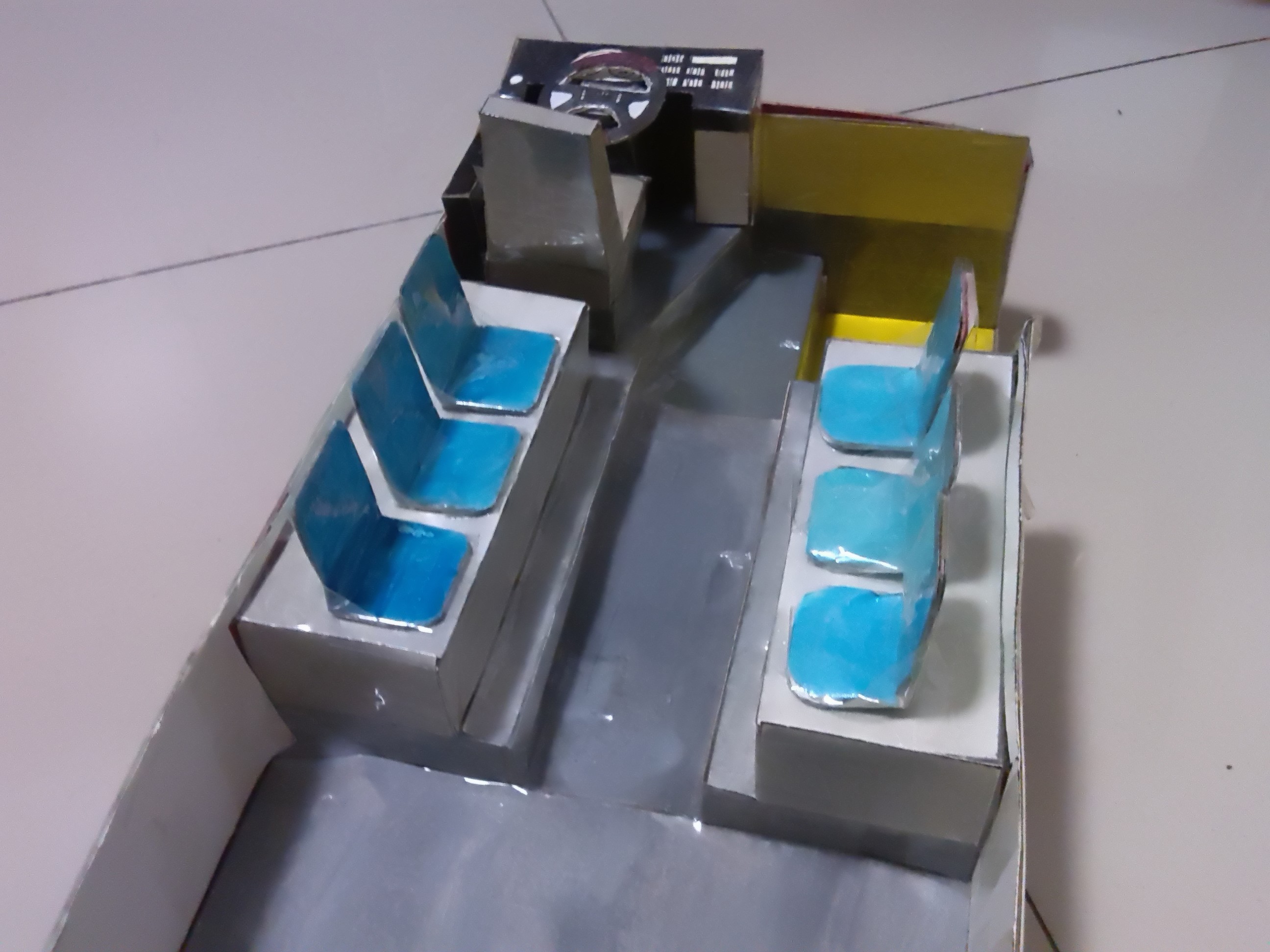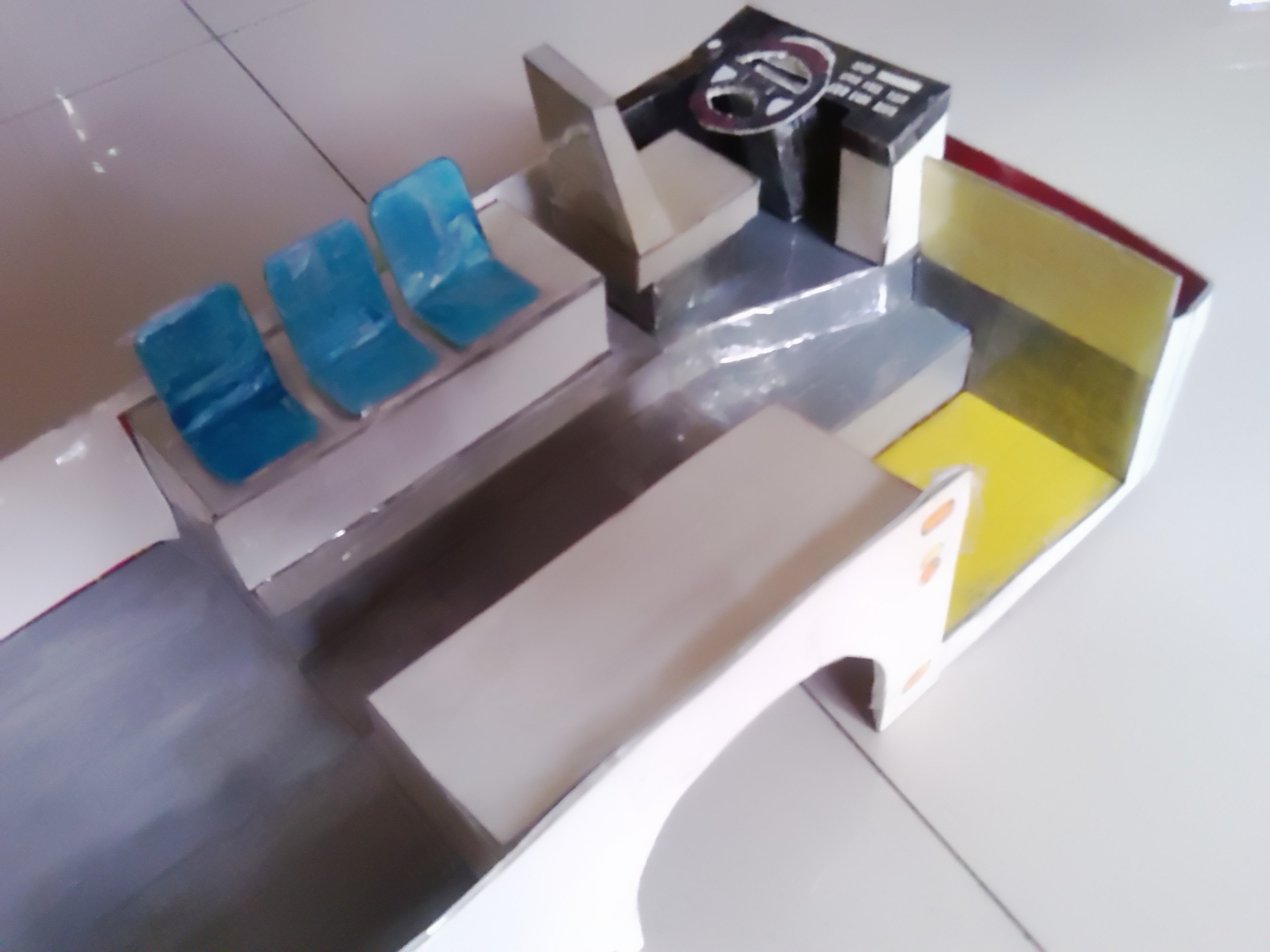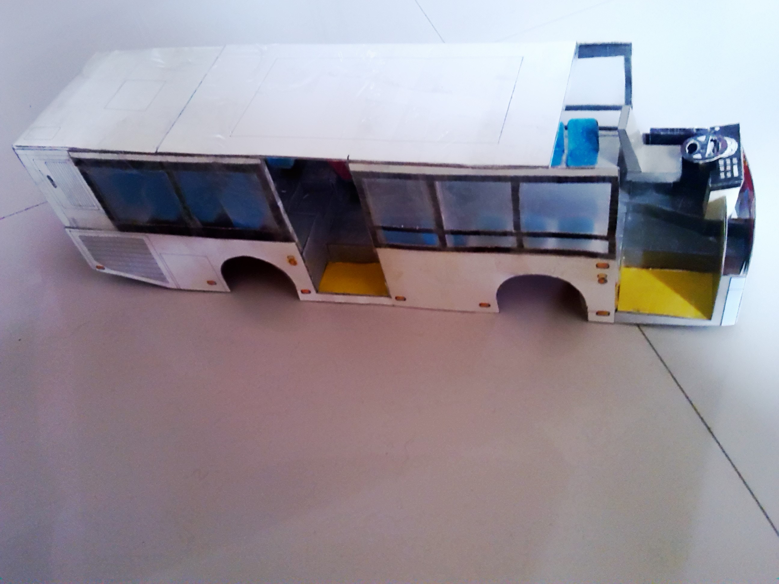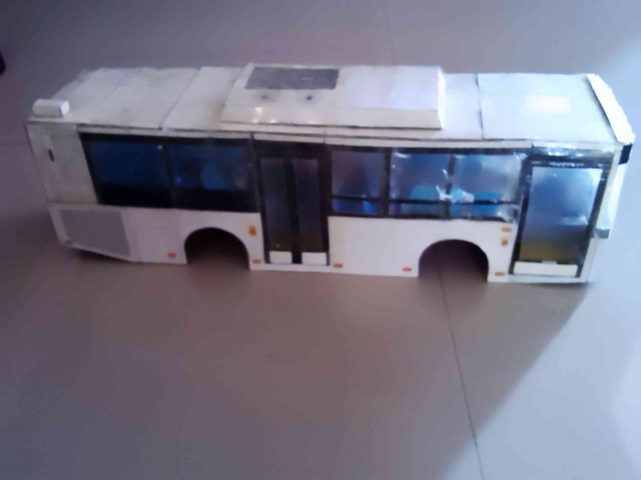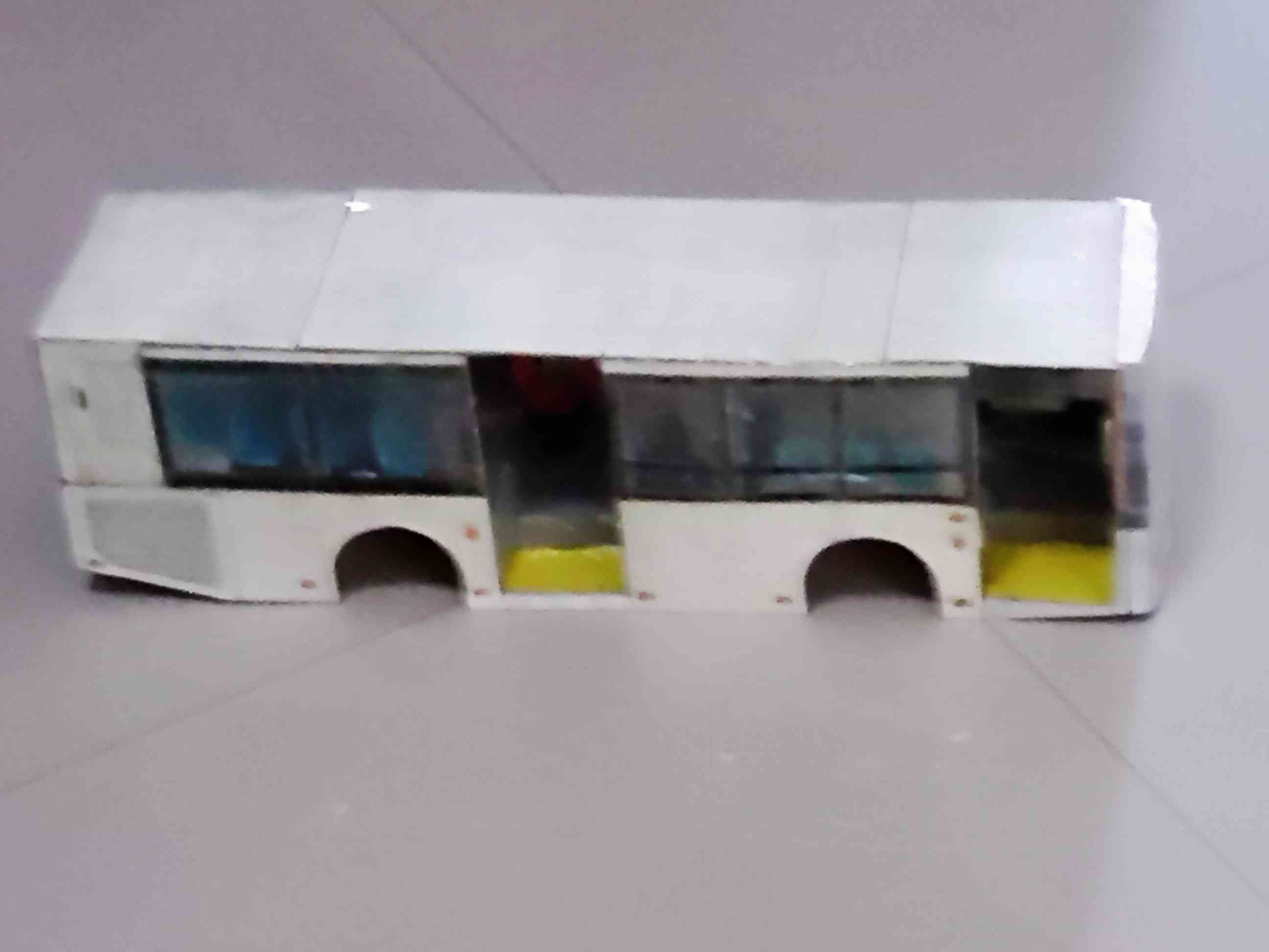 车身外表完善 开始内饰制作,驾驶区 驾驶区的细节是费了一点心思的 乘客座椅,有点简陋~ 做好后一个一个粘上 还有爱心座椅 总算粘贴完了 就差侧窗、封顶和前挡了 封装完成,对了,还忘了轮胎 前脸效果 置顶空调